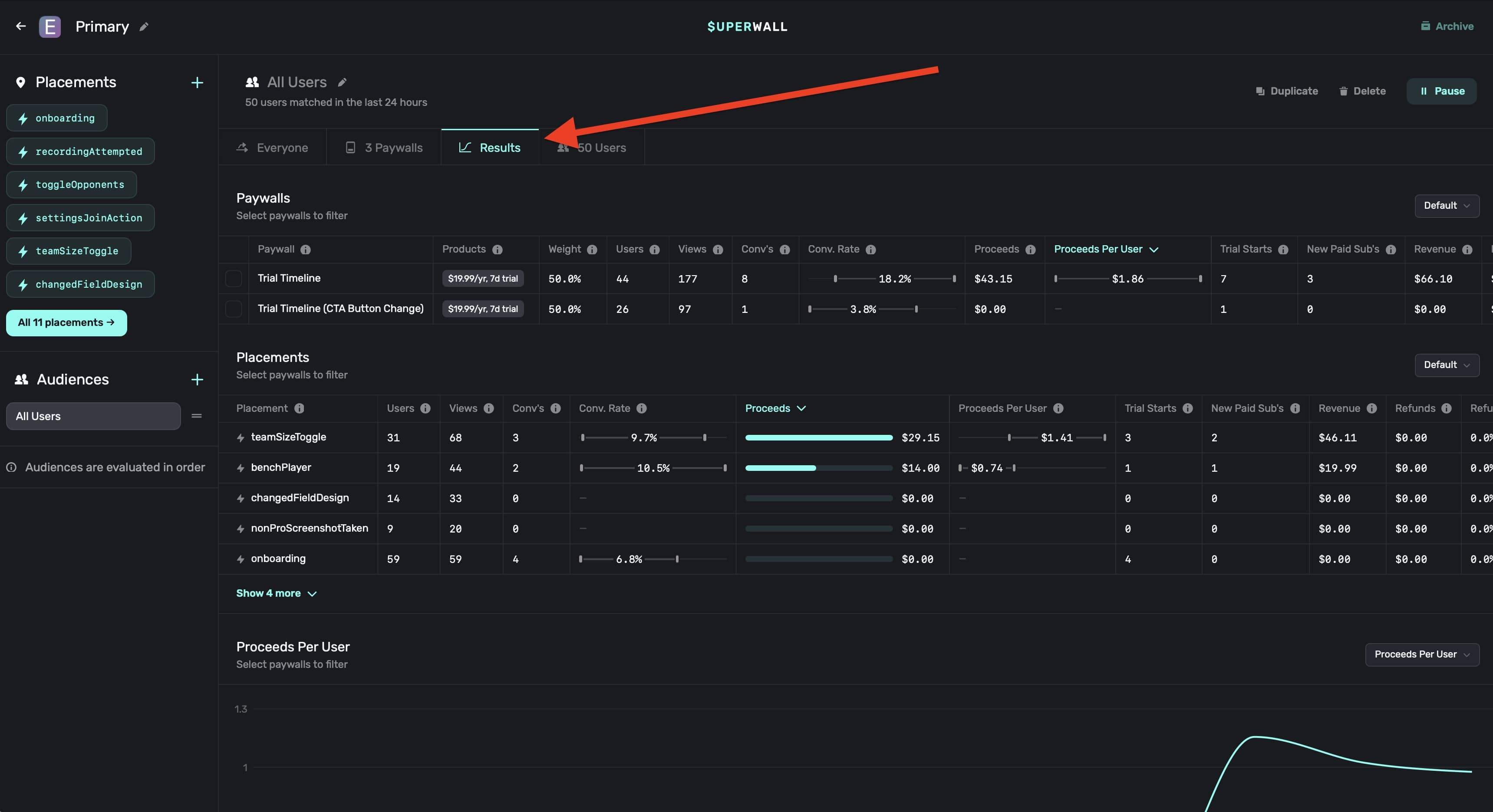 Here, you'll see each paywall being used (or that was used) in an experiment. Superwall will show you metrics such as proceeds, users and much more. There are several metric to explore, and you can hover over any of them to get more details about what each metric represents: