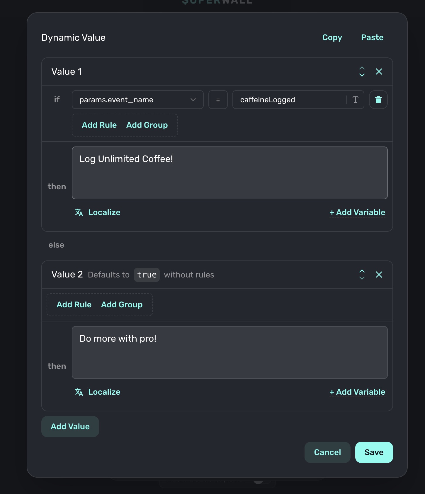 But, more commonly, you might use it with a dynamic value. Then, you can customize your paywall based on the event name: