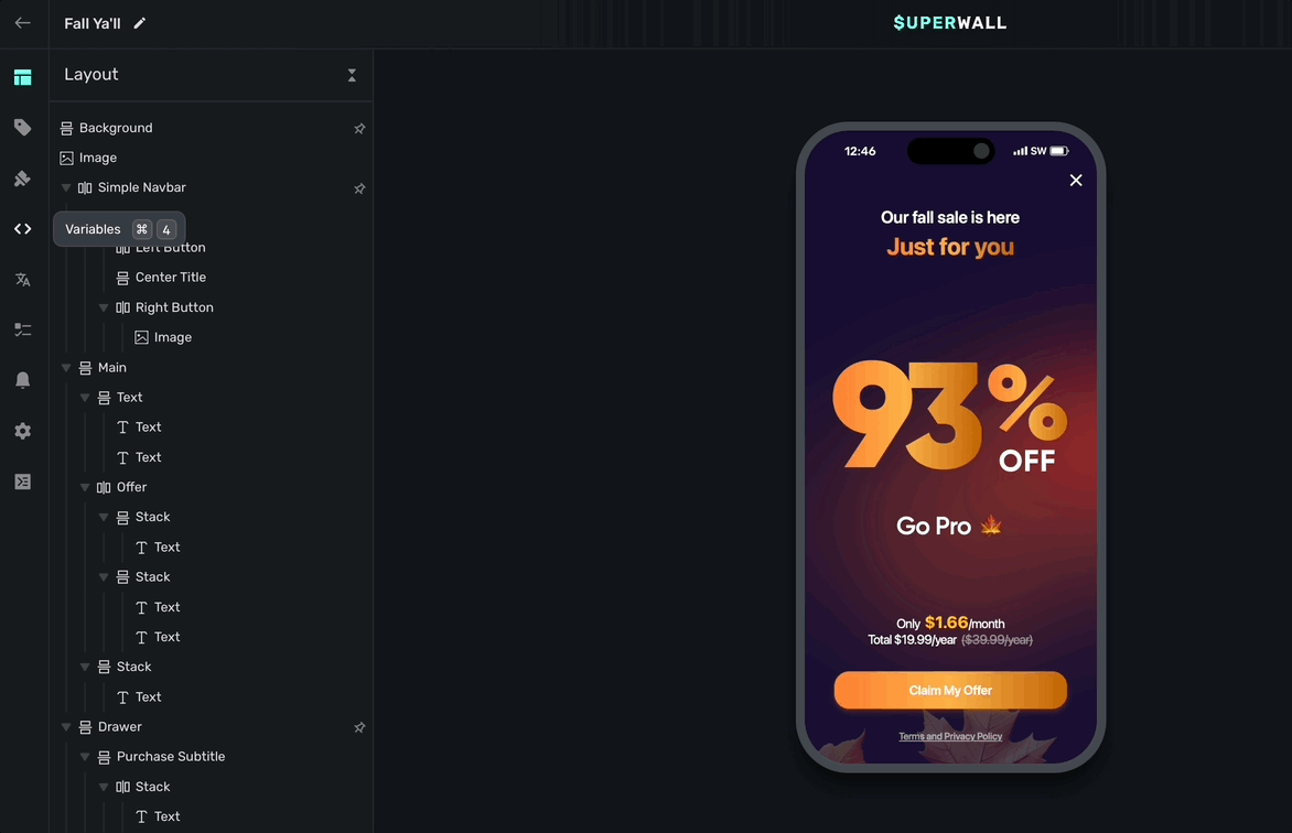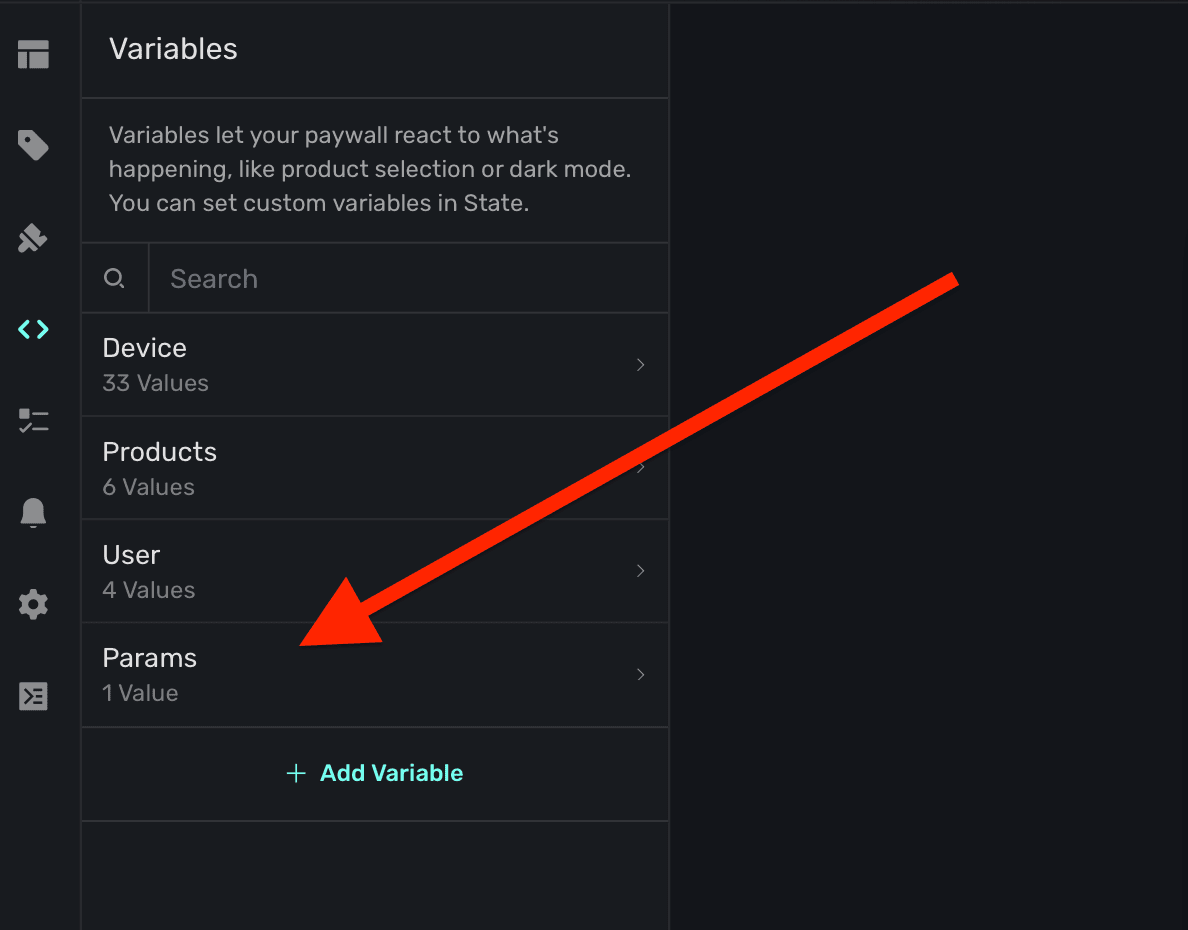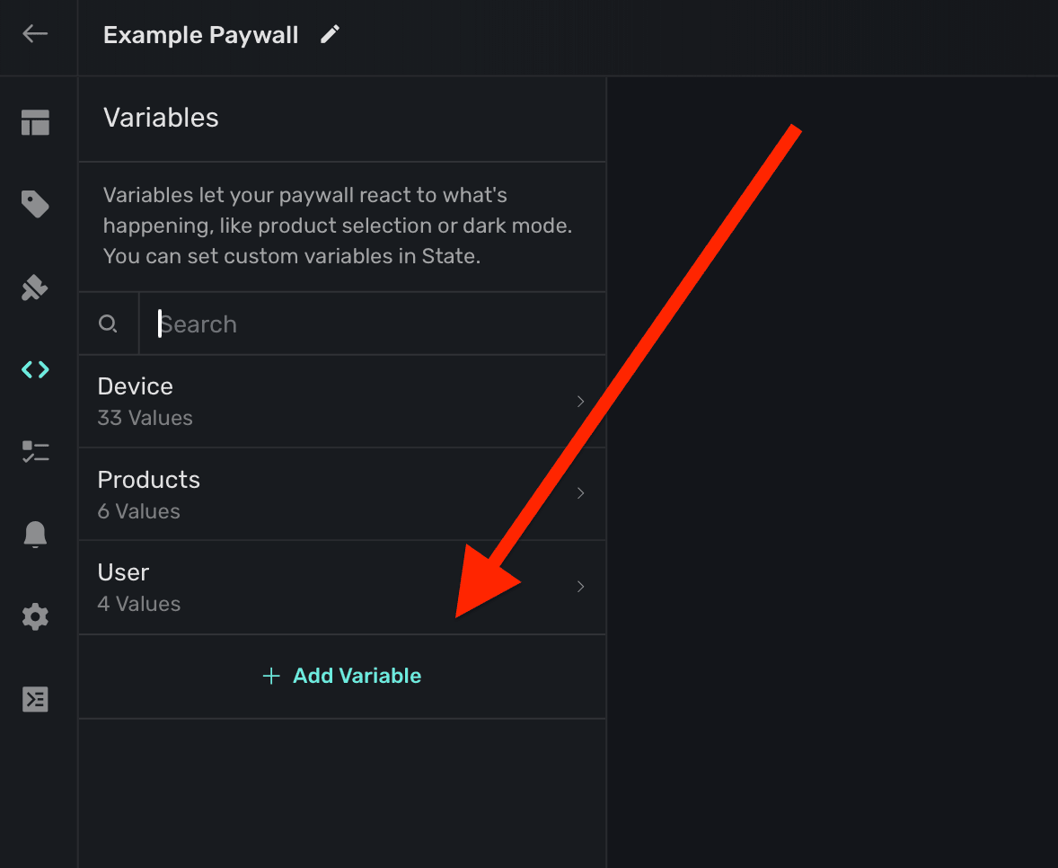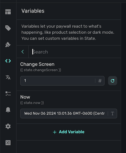 Often times, you'll want to test things like introductory or trial offers, a certain page within a paging design, or keep a modal drawer open to tweak its contents or look. To do that, simply change the variable's value in the editor. On the left sidebar, click Variables and then search for the one you're after and set its value.