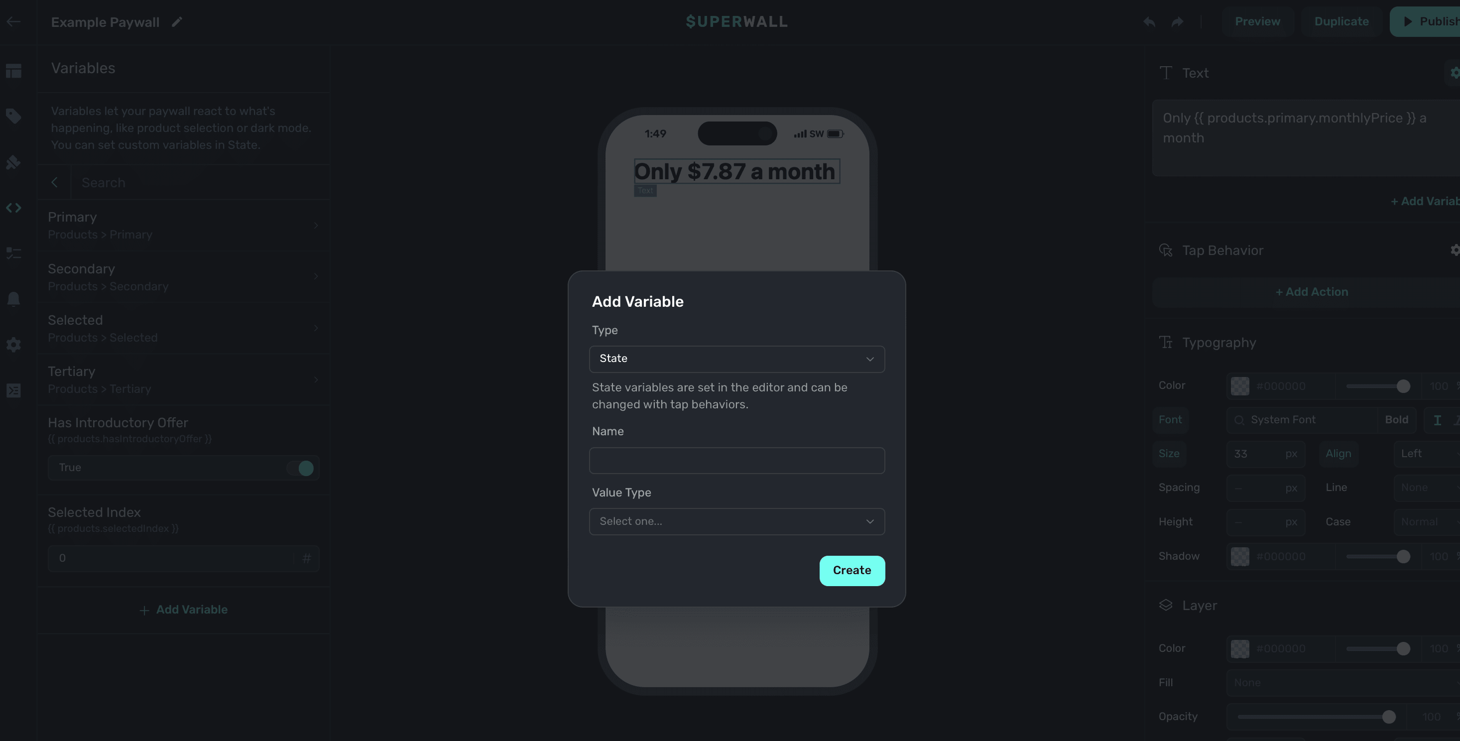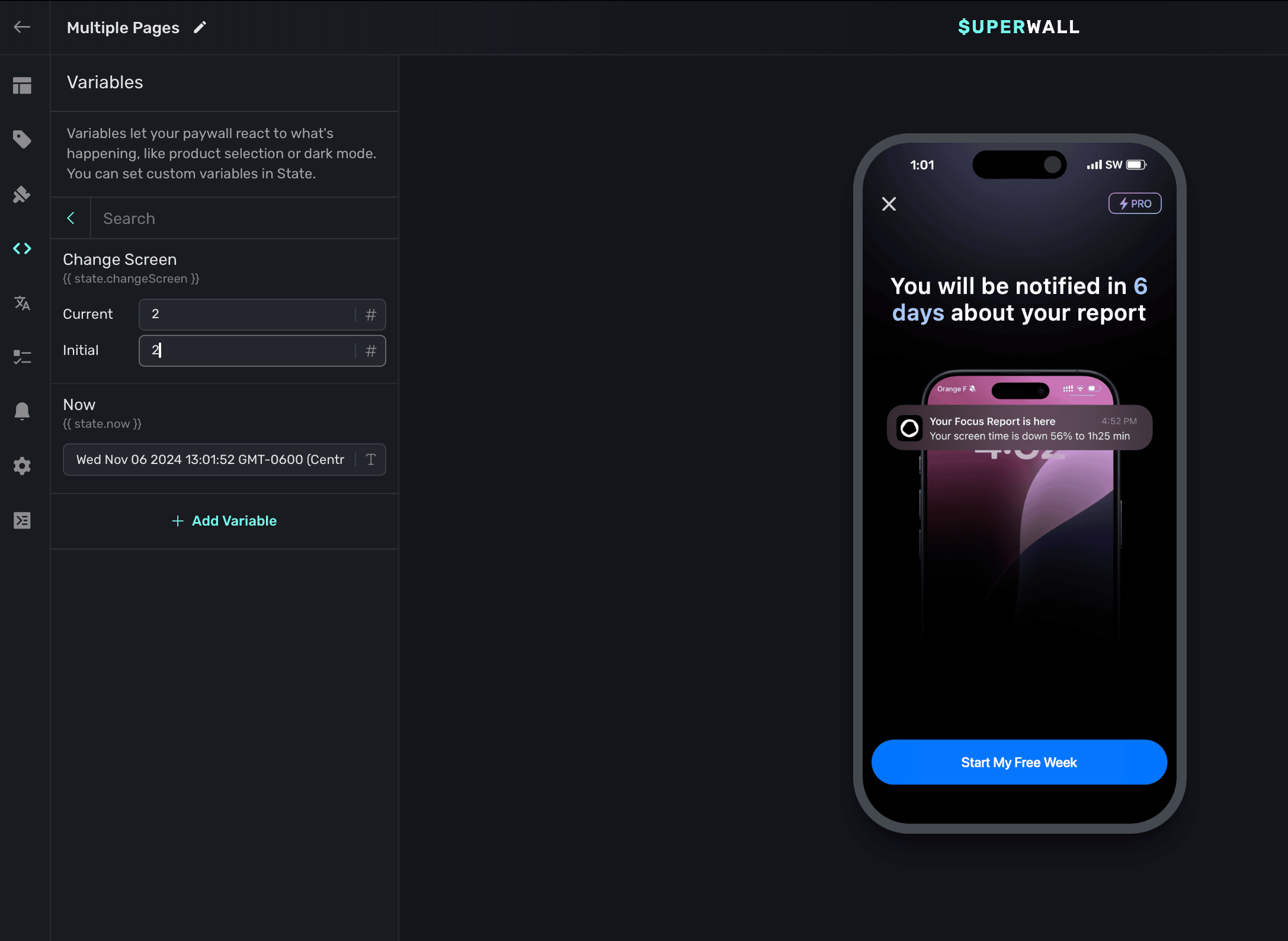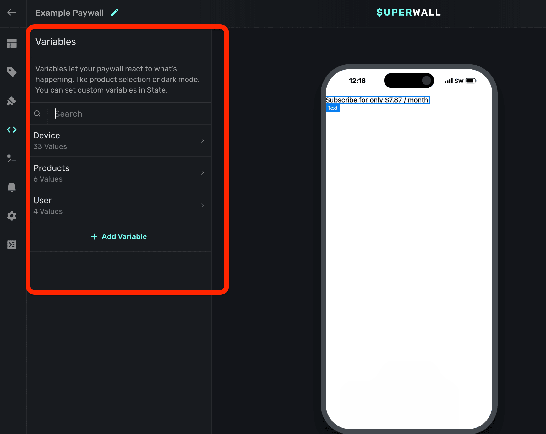Often times, you'll want to test things like introductory or trial offers, a certain page within a paging design, or keep a modal drawer open to tweak its contents or look. To do that, simply change the variable's value in the editor. On the left sidebar, click Variables and then search for the one you're after and set its value.