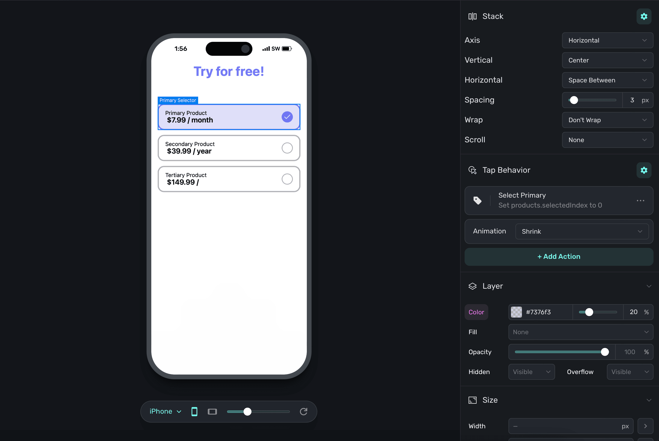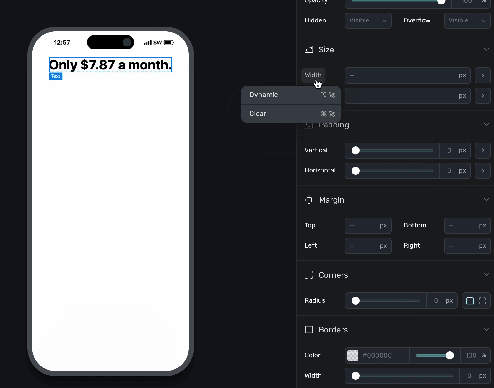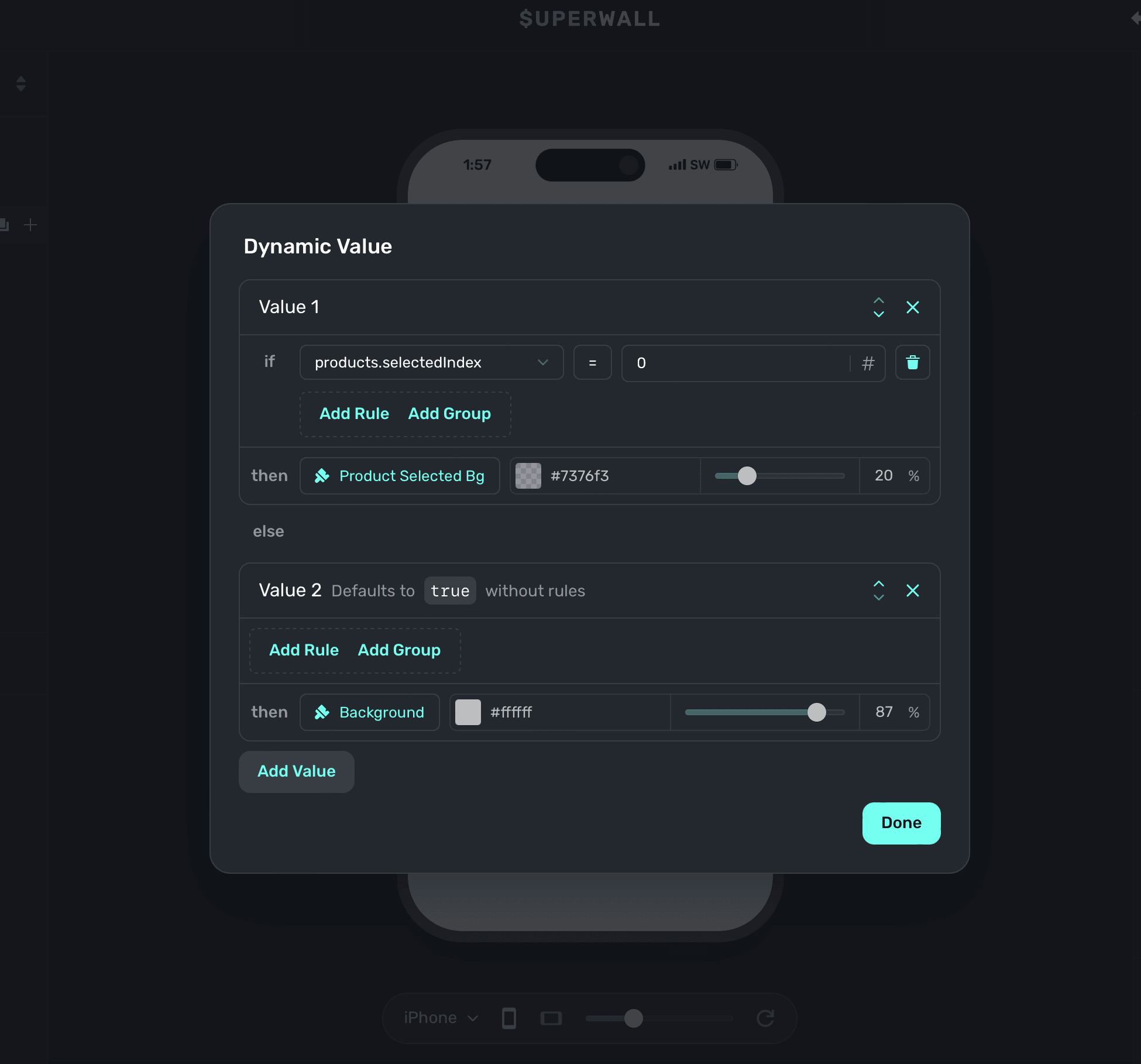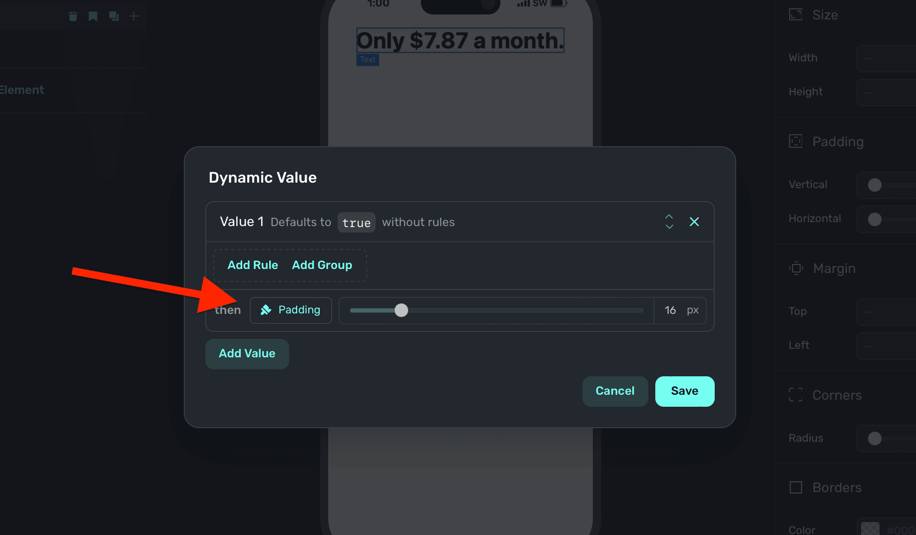 Above, the "padding" variable was used. You can ignore the if/then rules above if you simply want to apply a variable, but to dynamically enable or disable them — you can set conditions accordingly. Read the docs over dynamic values to learn more.