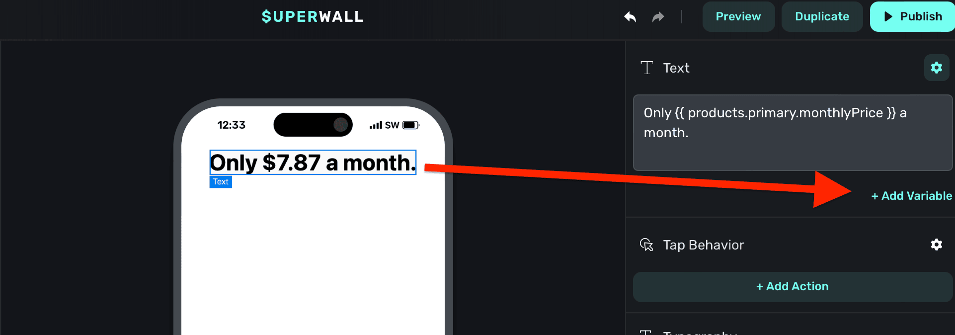 - Under Text -> click "+ Add Variable".