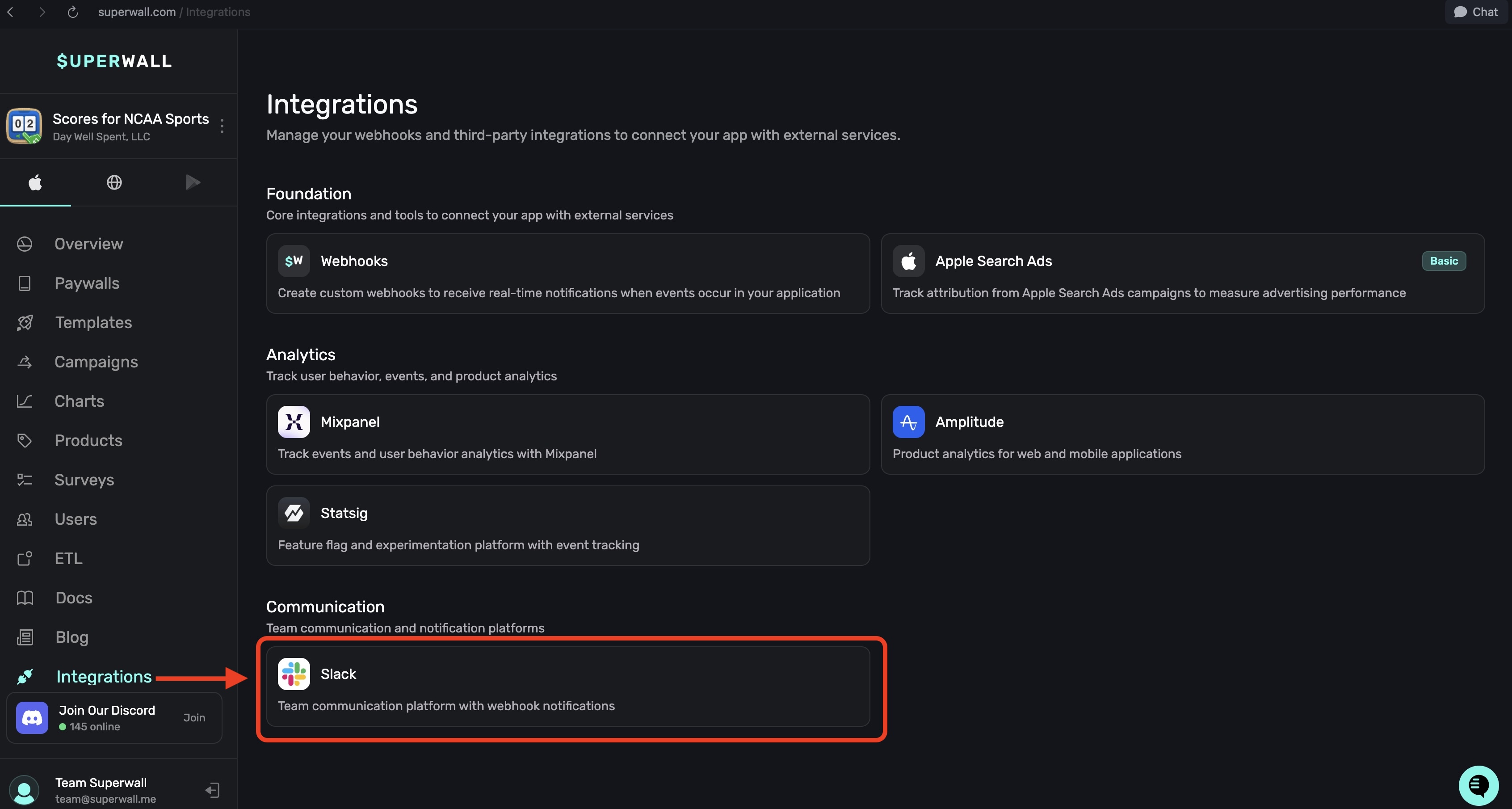 In the Communication section within Integrations, you can connect your Slack account to Superwall: