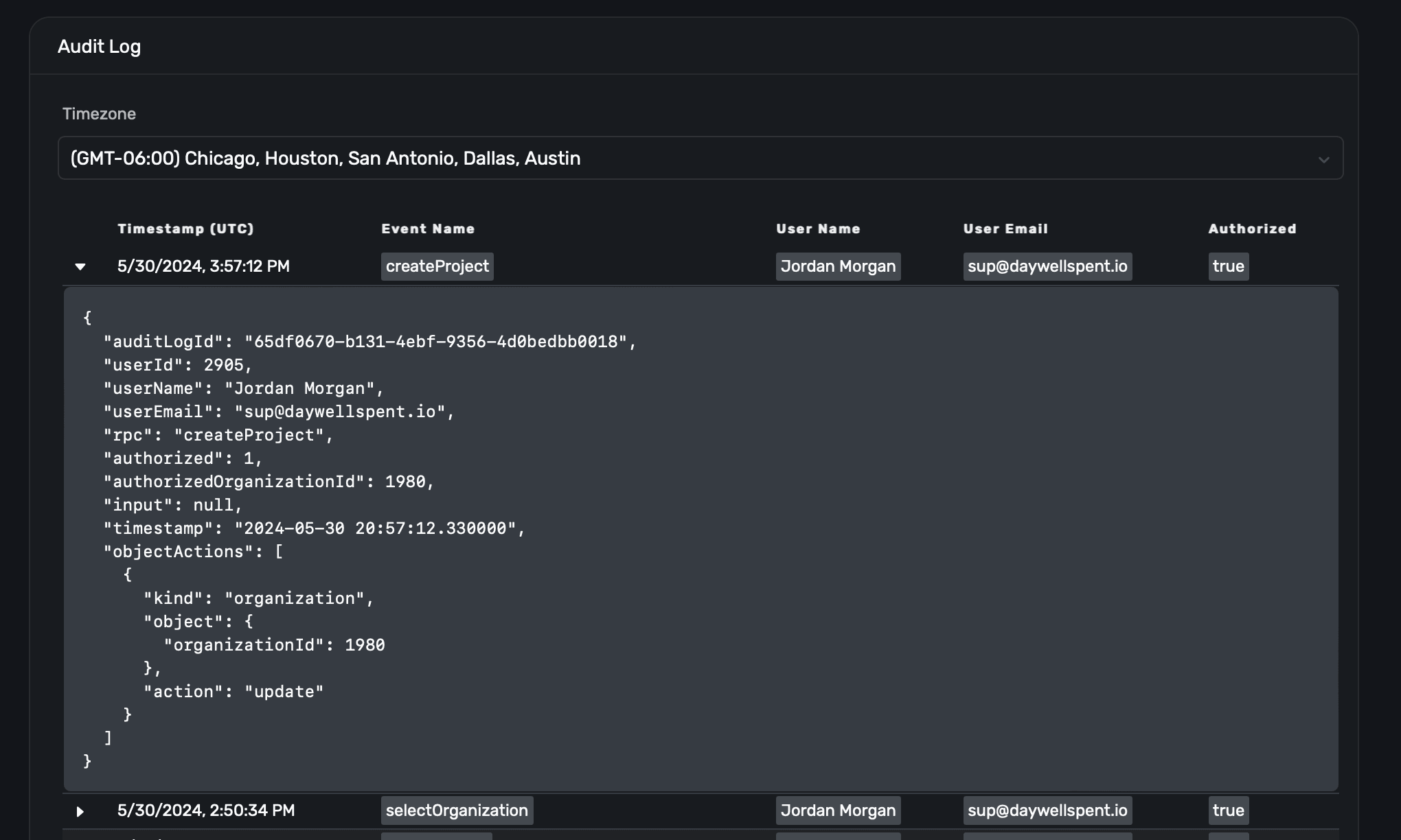In the Audit Log section within Settings, you can view virtually any action taken by users within Superwall: