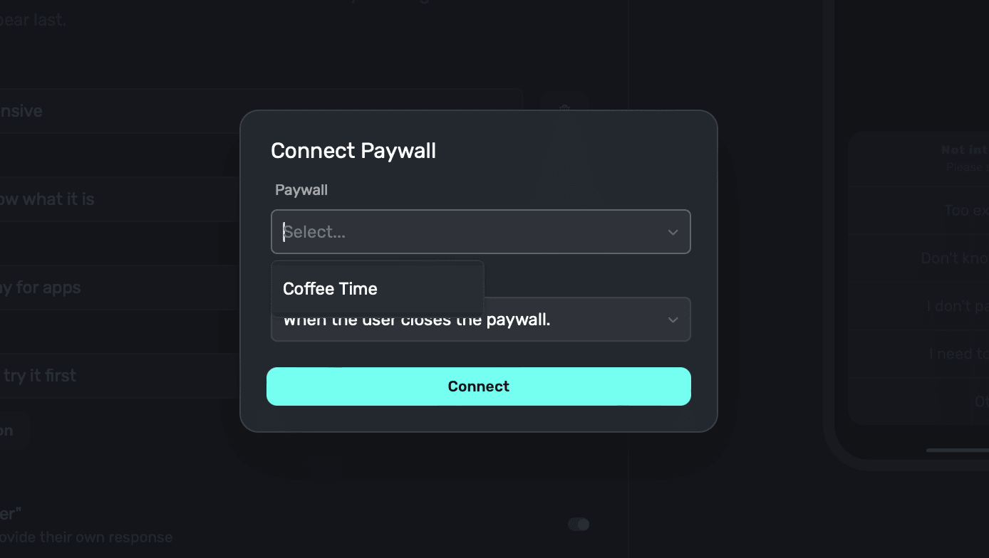 After you've selected a paywall, click the Connect button and you're all set. From there, each user will only see the survey once per paywall.