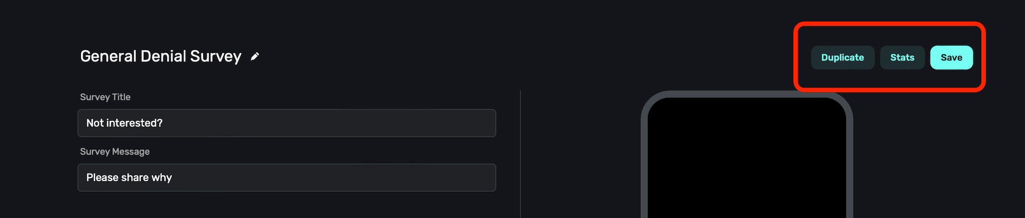 To duplicate a survey, click the Duplicate button at the top-right when inside the survey editor: