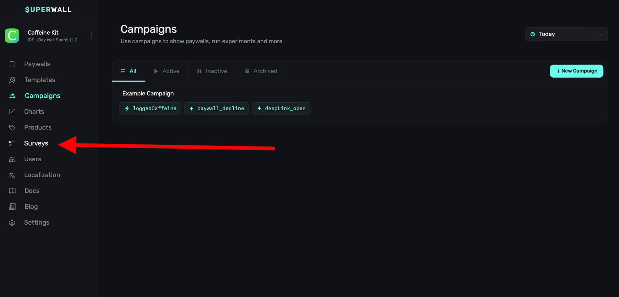 To attach a survey to a paywall, edit one or manage existing surveys, click the Survey button found on the sidebar: